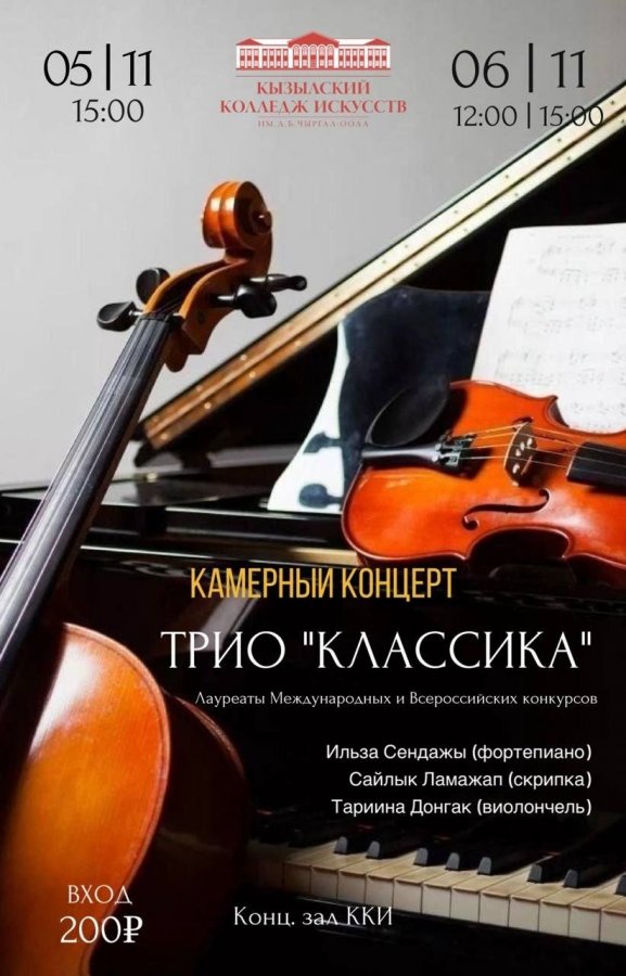 В составе трио — талантливые музыканты: фортепиано - Ильза Сендажы, преподаватель и концертмейстер ККИ им. А. Чыргал-оола, виолончель - Тариина Донгак студентка 4 курса отделения «Струнные инструменты» ККИ им. Чыргал-оола; артистка симфонического оркестра им. В. Токи, скрипка - Сайлык Ламажап, артист симфонического оркестра им. В. Токи